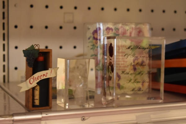 Shelf lot of items including coin counters, coin trays, glass knick knacks