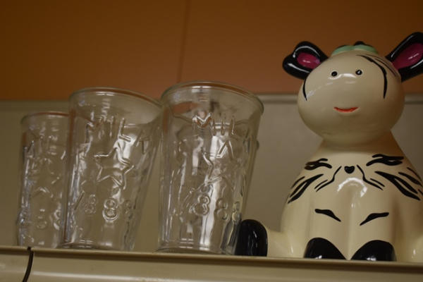 Shelf contents consisting of milk bottles, milk glasses and ceramic cow