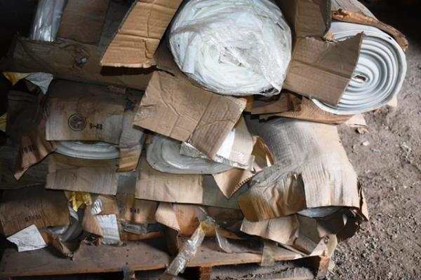 Pallet of plastic and roofing material, plastic appears to be 20' x 100' rolls, some of 6 mil