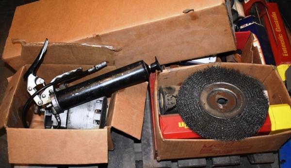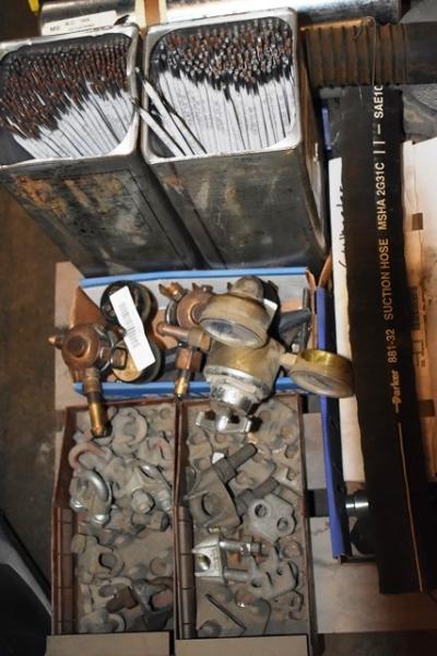 Pallet lot of welding rod, hoses, torch regulators, grease gun, etc.