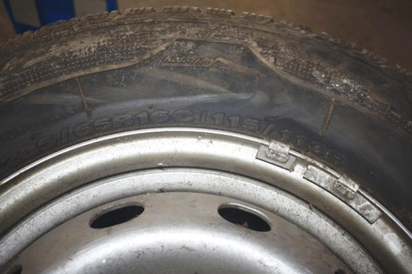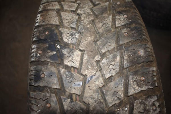 Lot of tires and wheels consisting of 2 235/65R16C studded tire on 5-lug steel rims, Goodyear Marathon ST205/75R15 on 6-lug rim