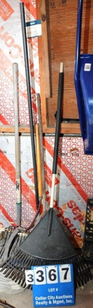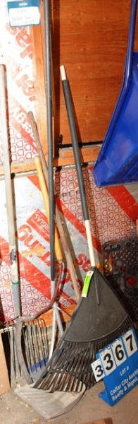 Lot of yard tools including rake, shovel, sickle bar, snow rake, pitch fork