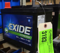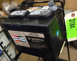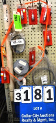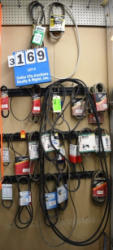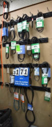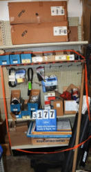 Pegboard rack of Champion Spark Plugs, pulleys and cables