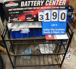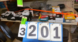 Shelf lot of chainsaw chains, florescent light bulbs, and some misc. lawnmower parts