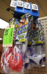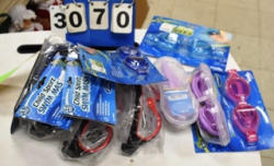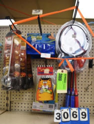 Lot including badminton rackets, goggles, note pad, pumpkin gutter