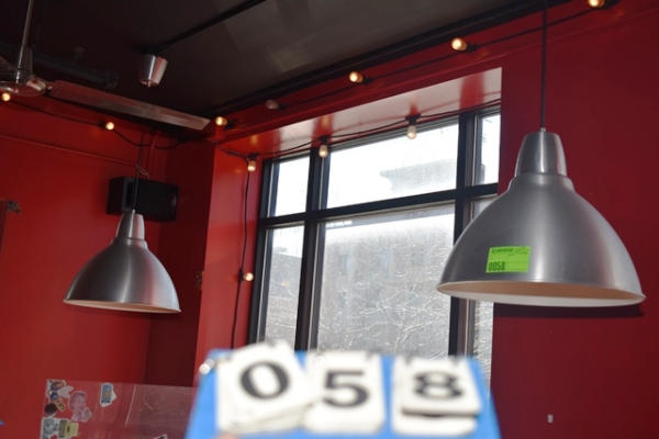 Lot of 5 hanging lamps (WILL NEED A LADDER FOR REMOVAL). Buyer must supply a certificate of insurance prior to removal. Buyer must wire nuts and install a blank plate upon removal.