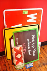 Lot of assorted signs and dry erase board