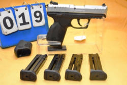 Ruger SR 22E, .22 LR caliber, semi-automatic hand gun, 3 1/4" barrel, ambidextrous safety and mag release, with 4 spare 10-round magazines and 1 grip and original box and holster, SN: 364-16234 (WILL REQUIRE FEDERAL 4473 BACKGROUND CHECK. WILL REQUIRE NEW YORK STATE PISTOL PERMIT FOR NEW YORK SALES)