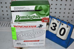 Lot of 2 boxes of 230 grain, 45 automatic, ammunition, 1 box of 100 Remington jacketed hollow points, 1 box of 200 Winchester full metal jackets