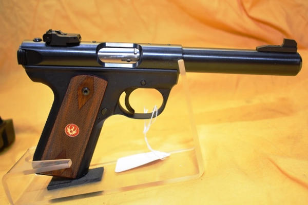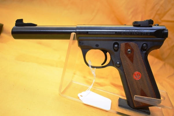 Ruger Target Model 22/45 Mark II, 22 caliber long rifle, 5 1/2" barrel, semi-automatic hand gun with 3 spare magazines and scope mounting bracket, fluted barrel, and various extra front sights and case. SN: 274-41126 (WILL REQUIRE FEDERAL 4473 BACKGROUND CHECK. WILL REQUIRE NEW YORK STATE PISTOL PERMIT FOR NEW YORK SALES)