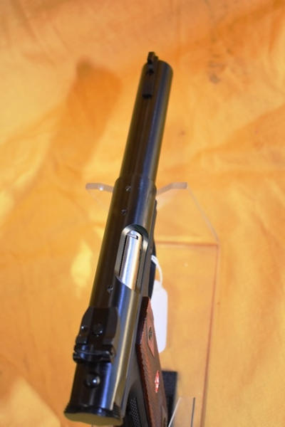 #11 – Ruger Target Model 22/45 Mark II, 22 caliber long rifle, 5 1/2" barrel, semi-automatic hand gun with 3 spare magazines and scope mounting bracket, fluted barrel, and various extra front sights and case. SN: 274-41126 (WILL REQUIRE FEDERAL 4473 BACKGROUND CHECK. WILL REQUIRE NEW YORK STATE PISTOL PERMIT FOR NEW YORK SALES)