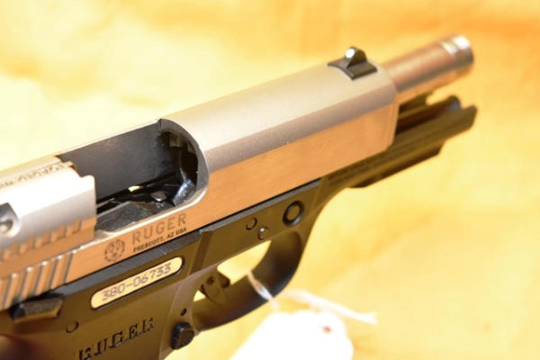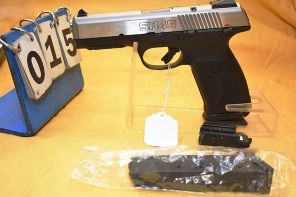 Ruger SR 45, 45 auto, semi-automatic hand gun with spare 10-round magazine and laser sight, 4 1/4" barrel, in case, SN: 380-06733, ambidextrous safety (WILL REQUIRE FEDERAL 4473 BACKGROUND CHECK. WILL REQUIRE NEW YORK STATE PISTOL PERMIT FOR NEW YORK SALES)