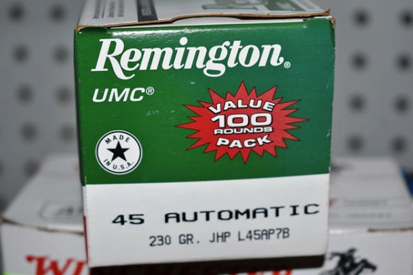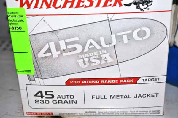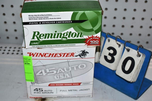 Lot of 2 boxes of 230 grain, 45 automatic, ammunition, 1 box of 100 Remington jacketed hollow points, 1 box of 200 Winchester full metal jackets