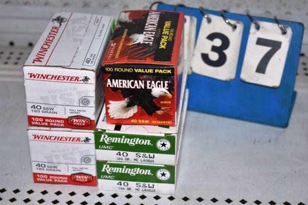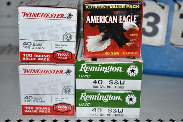 Lot of 7 boxes of 40 S&W ammunition including 2 boxes of 100 rounds of Winchester 165 grain full metal jacket, 1 100 box of American Eagle 180 grain full metal jacket and 2 boxes of Remington 180 grain metal case