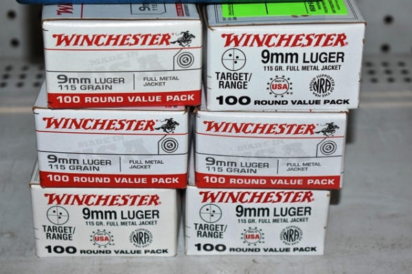 Lot of 6 boxes of Winchester 9mm Luger 115 grain full metal jacket ammunition, 100 round boxes