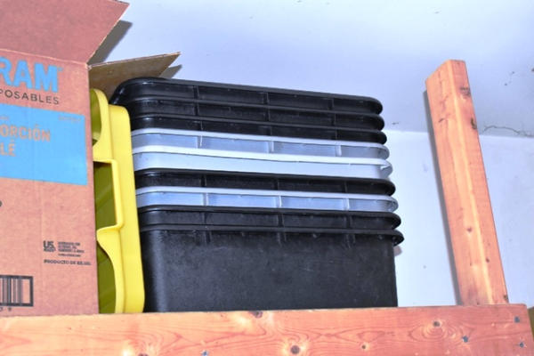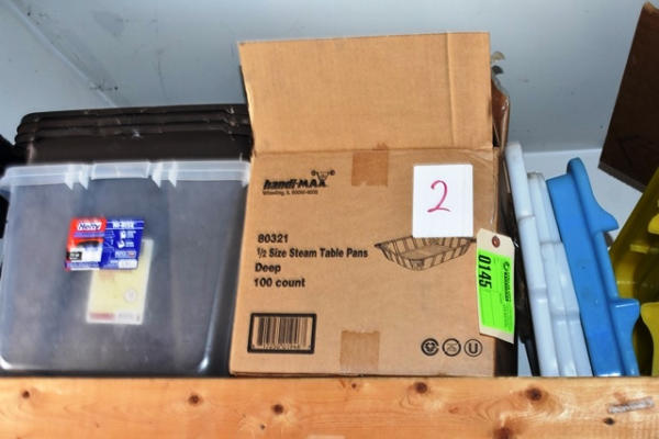 Shelf Lot,Top Shelf ONLY-Steam Table Pans, Assorted Plastic Lids, Plastic Totes, Etc.