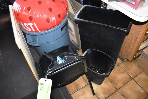 Assorted Sized Garbage Cans, Chalkboard, Chair and Inflatable Strawberry