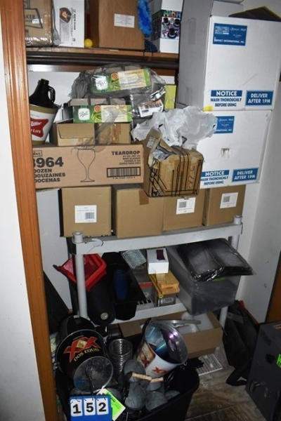 Closet Lot Consisting of Assorted Mason Jars, Wine Glasses, Cocktail Shaker, Beer Buckets, Etc.