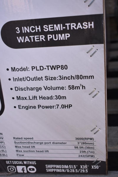 Paladin Industrial 3" Semi-Trash Water Pump Model PLD-TWP80 7HP, 242 Gal. Per Min Max. Flow (New In Box)