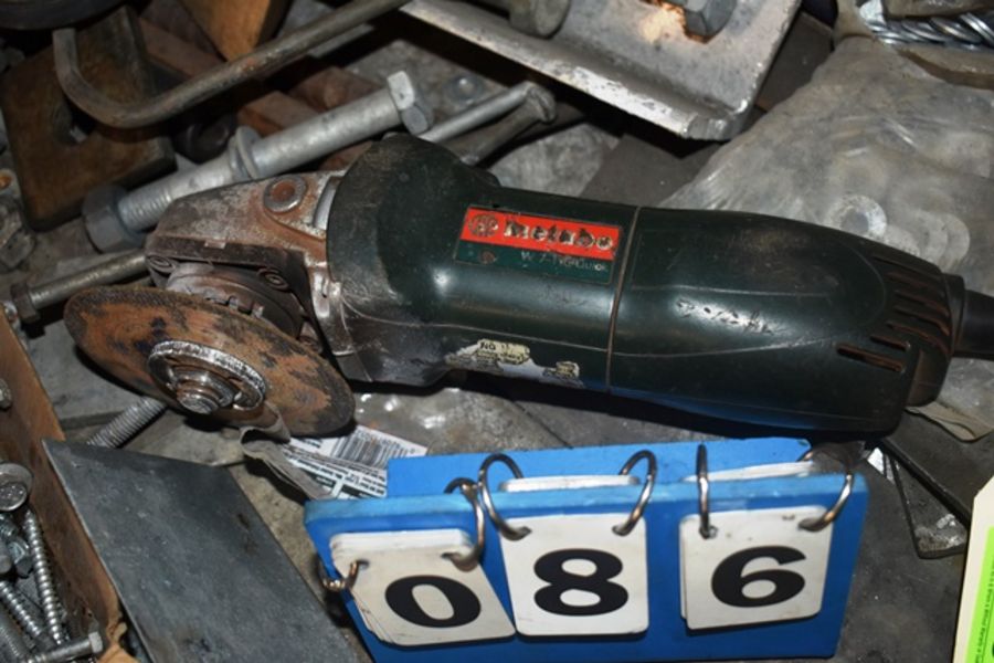 Contents of Top and Underside of Workbench Consisting of Nuts, Bolts, Exhaust Pipe, Grinder, C Clamp, Wood, Small Honda Gas Engine