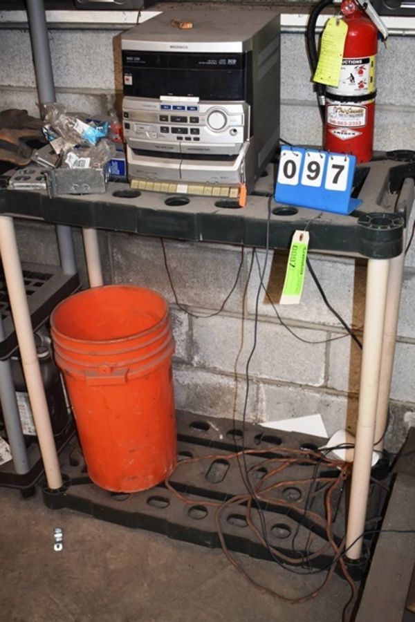 Shelving Unit and Contents Including Magnavox Radio, Assorted Electrical Supplies