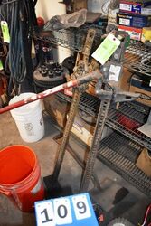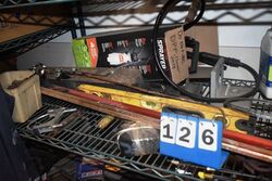 2 Shelf Lots Consisting of Air Hose, Levels, Push Broom Head