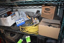 Shelf Lot Consisting of Electrical Wires, Casters, Caution Lights, Parts