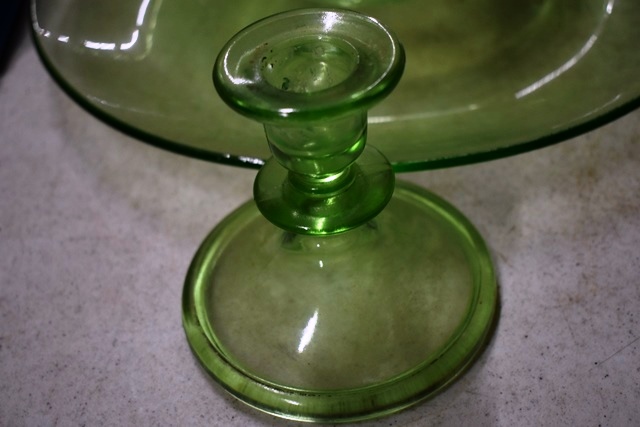 Vintage Green Depression Glass Possibly Vaseline Glass, Candlestick Holders and Tray
