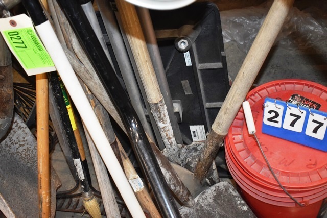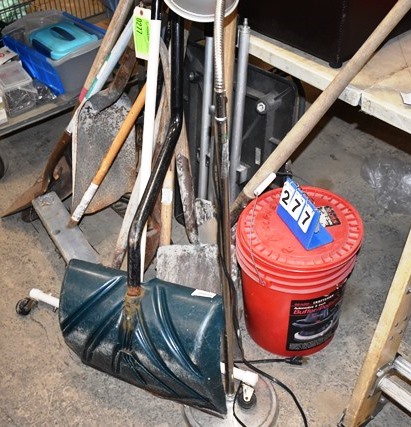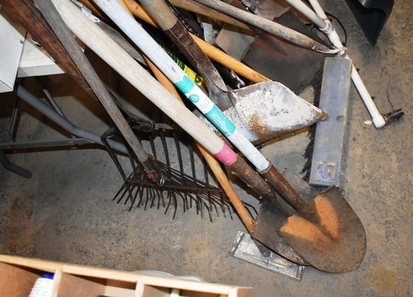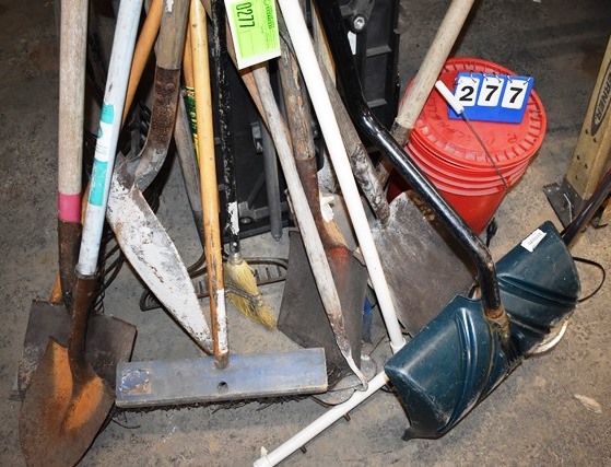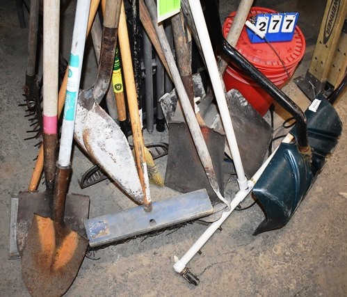 Lot of Shovels, Rakes, Etc. Includes Pedestal Light and Project Stand