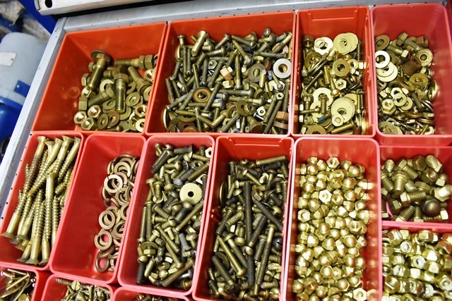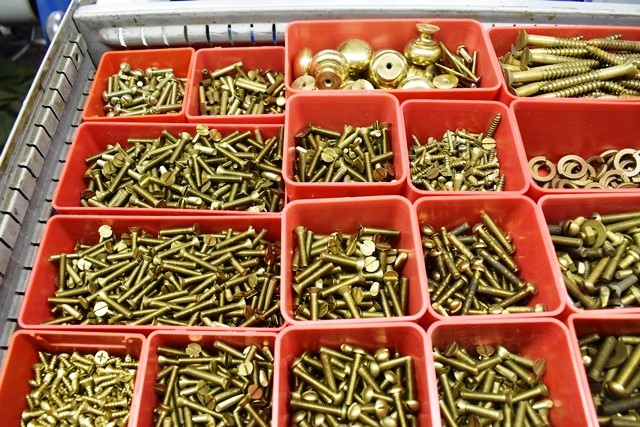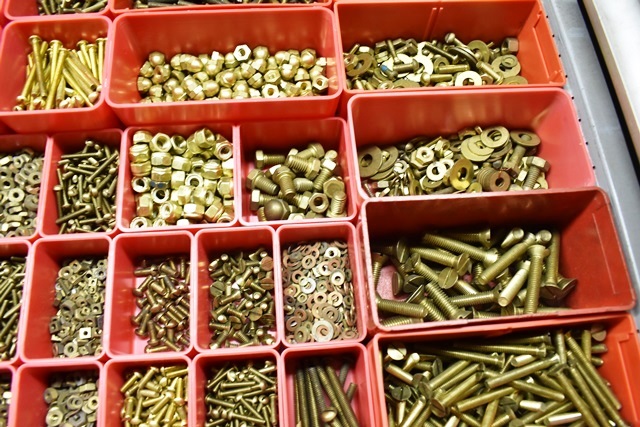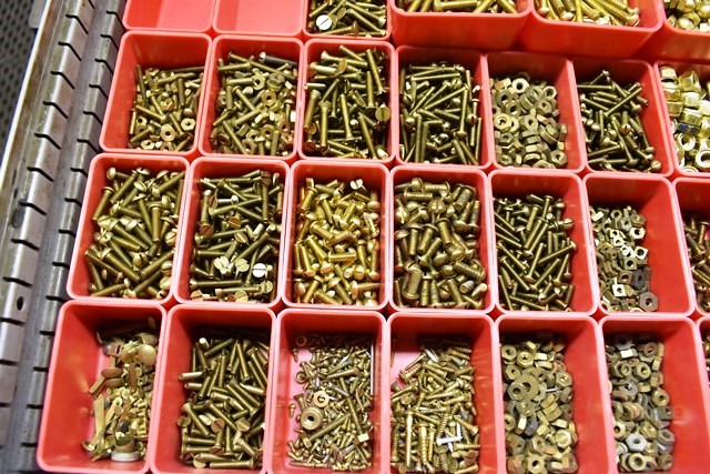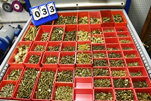 Drawer Contents (Drawer Not Included) Consisting of Assorted Brass Hardware, Machinist Screws, Bolts, Nuts, Bolts, Pulls, Screws, Etc.