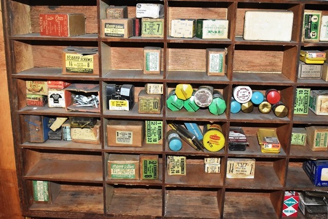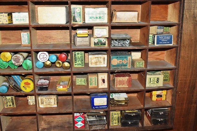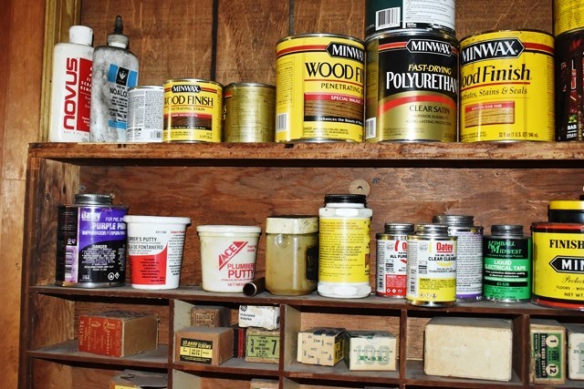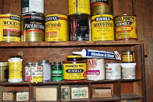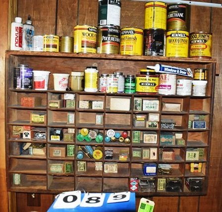 Shelving Unit with Assorted Screws, Polishes, Stains, Etc.