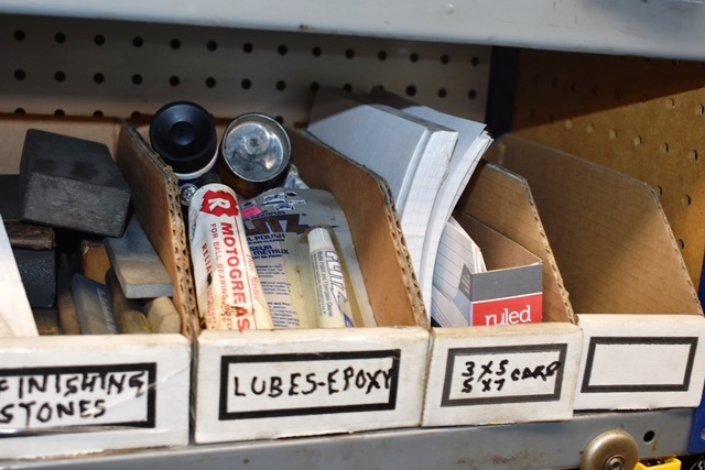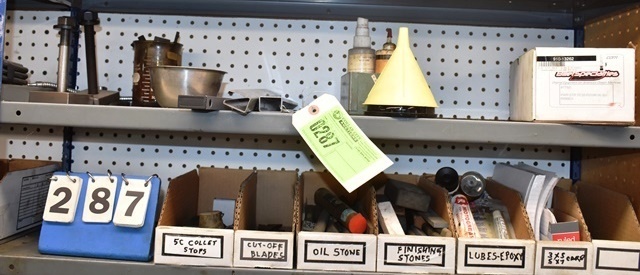 2 Shelf Lots Consisting of Sharpening Stones, Grease, Funnels, Cut Off Blades, 5C Collet Stops, Etc.