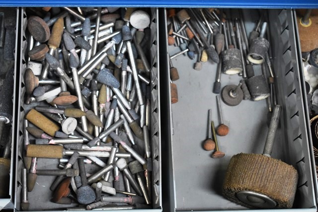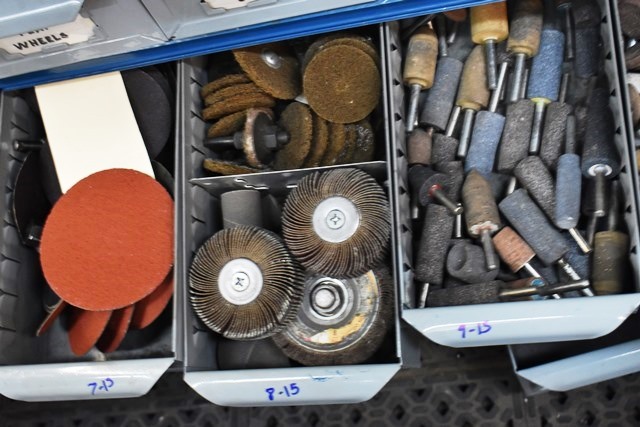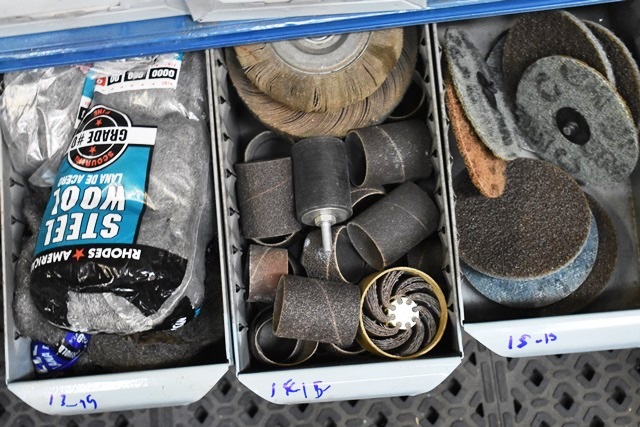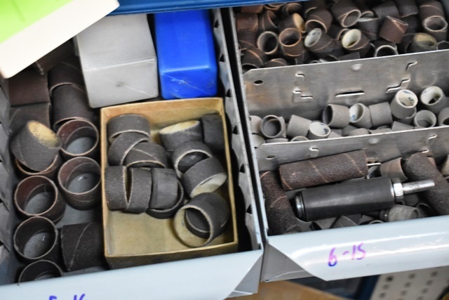 15 Drawers Consisting of Flap Wheels, Sanding Cones, Mounted Stones, Wire Wheels, Steel Wool, Etc. (CONTENTS ONLY, DRAWER NOT INCLUDED)
