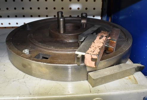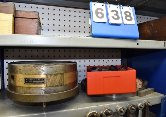 Shelf Lot Consisting of 8" Monarch Magnetic Chuck, Lathe Dogs, Monarch 11" Faceplate (CONTENTS ONLY, SHELF NOT INCLUDED)