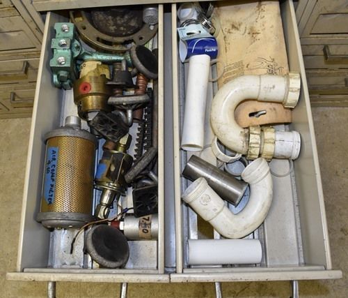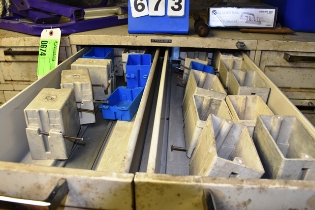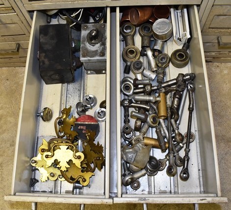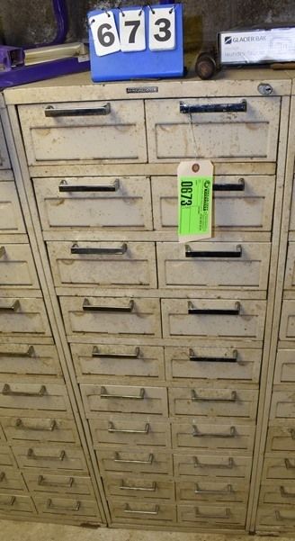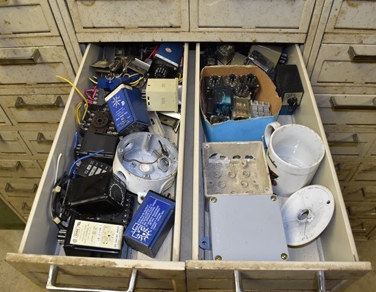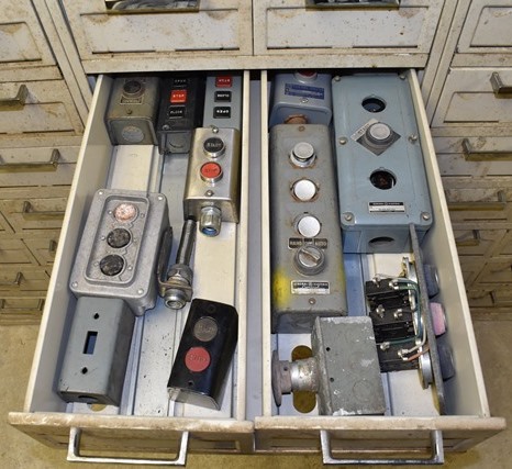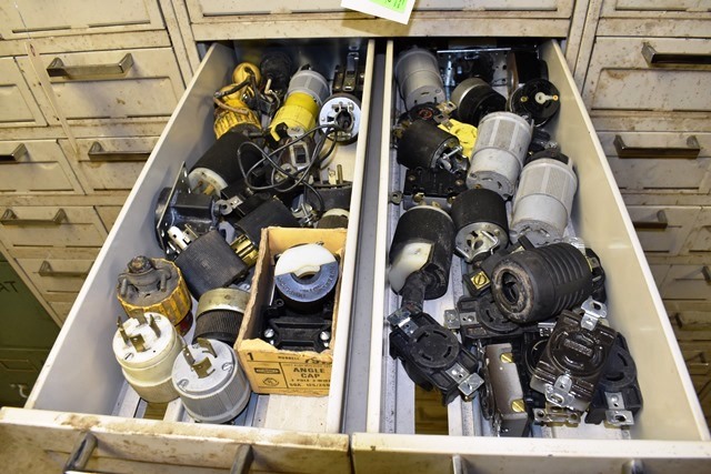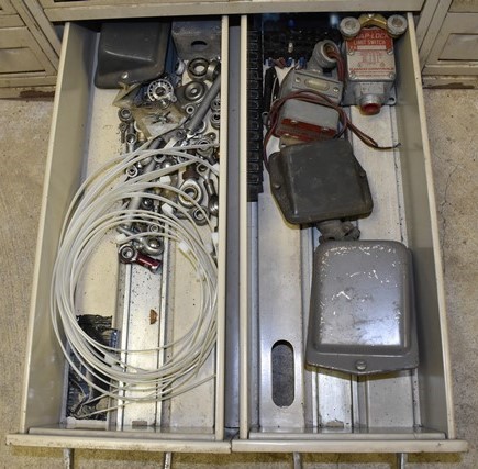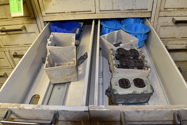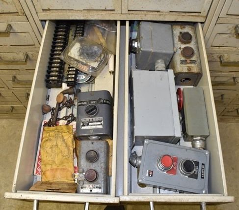 File Cabinet with Contents Consisting of Electrical Supplies, Outlets, Cord Ends, Push Buttons, Machinery Parts, Drawer Pulls , Etc.