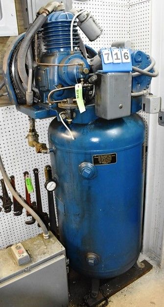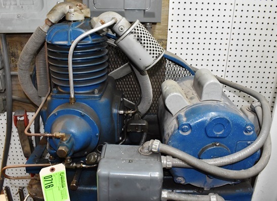 #716 – Air Compressor, Approx. 75 Gallon Tank, 7 1/2HP, 220V, Single Phase, Missing Belts, Motor Shaft Turns Freely as does Air Compressor Motor Head. Onsite Exclusive Rigger will disassemble and load on your trailer for the following flat fee: $100.00. No other rigger is permitted onsite.