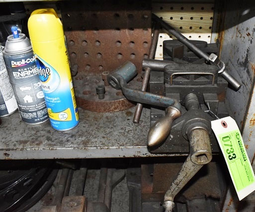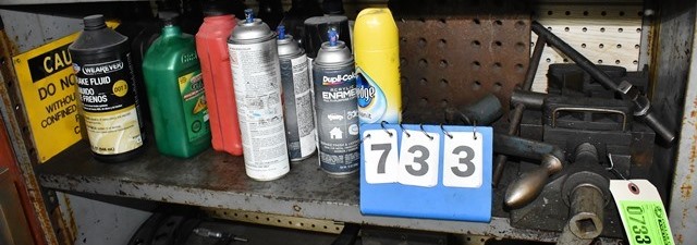 Shelf Lot Consisting of Machinist Vise, Handles, Brake Fluid, Paint, Etc.