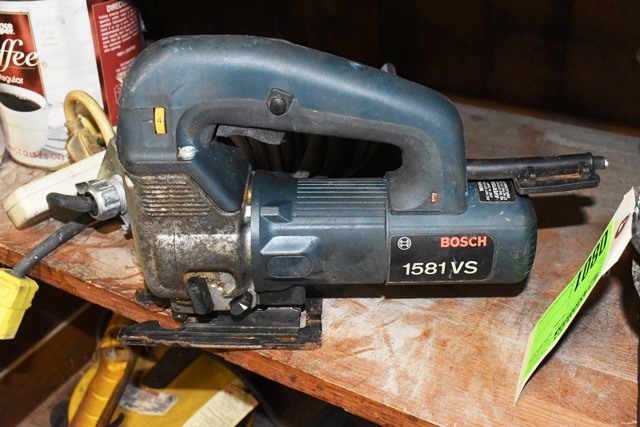 Shelf Lot Consisting of Jig Saw, Power Strip, Nuts/Bolts, Etc.