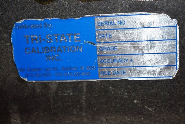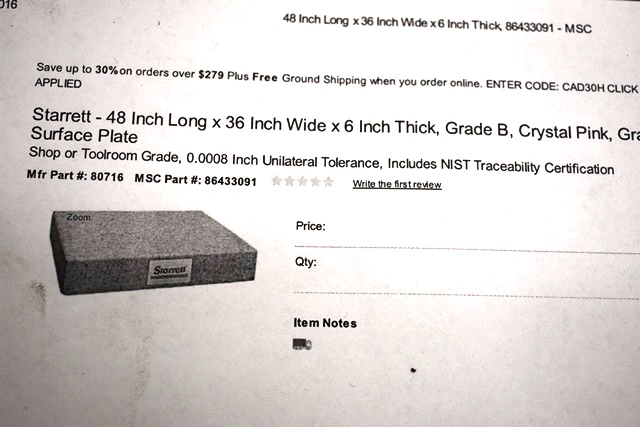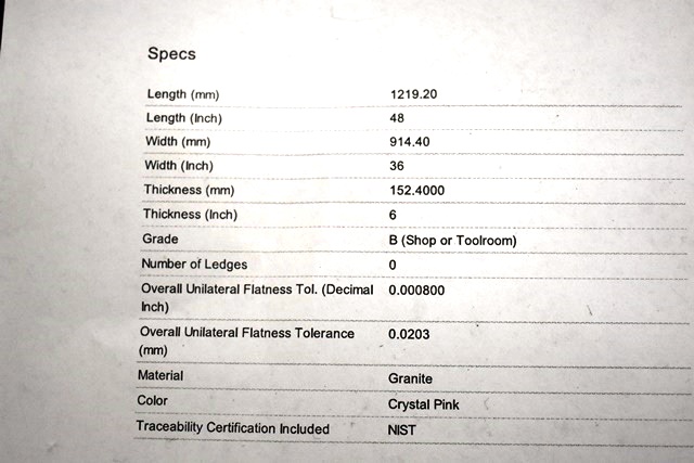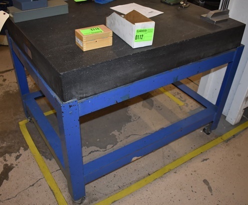 Starrett 40"L 36"W 6" Thick Grade B Crystal Pink Granite Inspection Surface Plate, Shop/Tool Room Grade, .0008" Unilateral Tolerance, On Rolling Stand. Onsite Exclusive Rigger will disassemble and load on your trailer for the following flat fee: $50.00. No other rigger is permitted onsite.